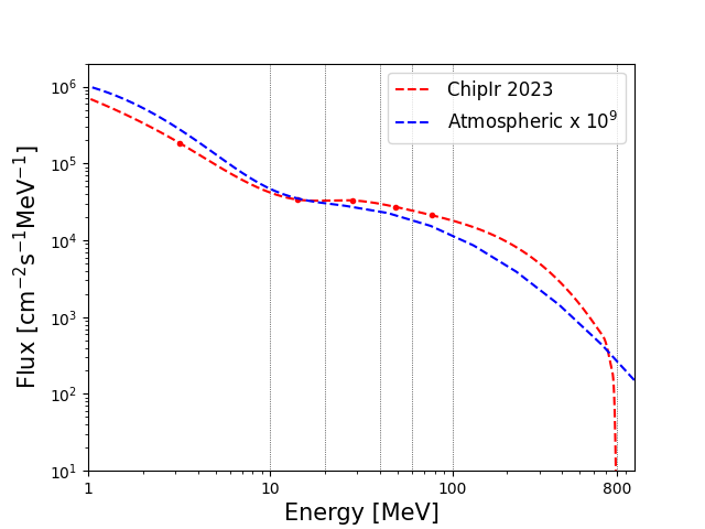The ChipIr neutron spectrum (up to 800 MeV) compared to the atmospheric spectrum at Ground Level. |