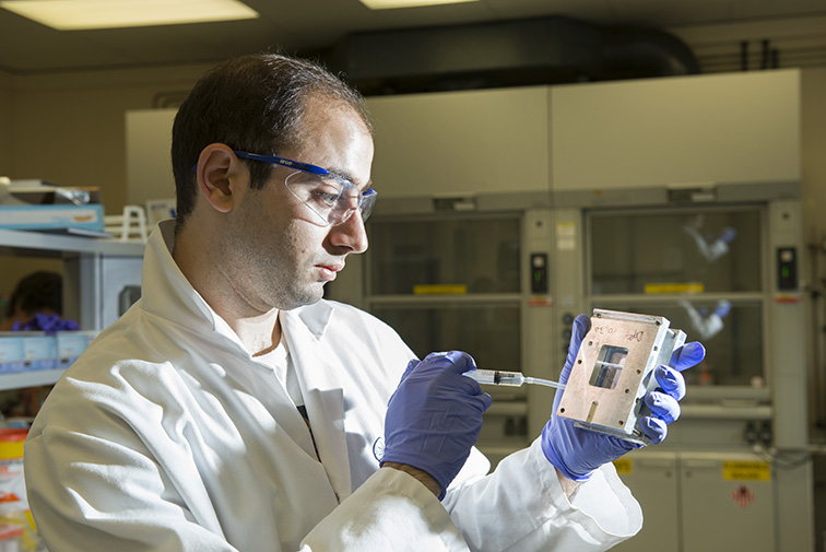 Lead author, Elias Pambou, University of Manchester, preparing samples in the laboratory at ISIS. Credit: STFC
