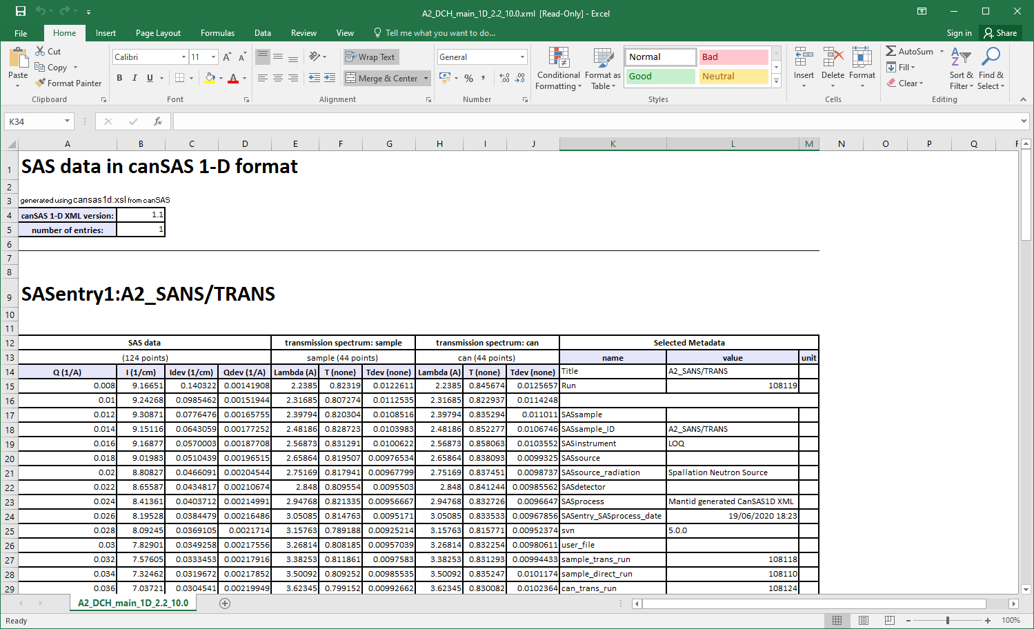 <?xml version="1.0"?><?xml-stylesheet type="text/xsl" href="cansas1d.xsl" ?><SASroot version="1.1" xmlns="urn:cansas1d:1.1" xmlns:xsi="http://www.w3.org/2001/XMLSchema-instance" xsi:schemaLocation="urn:cansas1d:1.1 http://www.cansas.org/formats1.1cansas1d.xsd" > <SASentry name=""> <Title>A2_SANS/TRANS</Title> <Run>108119</Run> <SASdata> <Idata><Q unit="1/A">0.008</Q><I unit="1/cm">9.16651</I><Idev unit="1/cm">0.140322</Idev><Qdev unit="1/A">0.00141908</Qdev></Idata> <Idata><Q unit="1/A">0.01</Q><I unit="1/cm">9.24268</I><Idev unit="1/cm">0.0985462</Idev><Qdev unit="1/A">0.00151944</Qdev></Idata> <Idata><Q unit="1/A">0.012</Q><I unit="1/cm">9.30871</I><Idev unit="1/cm">0.0776476</Idev><Qdev unit="1/A">0.00165755</Qdev></Idata> <Idata><Q unit="1/A">0.014</Q><I unit="1/cm">9.15116</I><Idev unit="1/cm">0.0643059</Idev><Qdev unit="1/A">0.00177252</Qdev></Idata> <Idata><Q unit="1/A">0.016</Q><I unit="1/cm">9.16877</I><Idev unit="1/cm">0.0570003</Idev><Qdev unit="1/A">0.00187708</Qdev></Idata> <Idata><Q unit="1/A">0.018</Q><I unit="1/cm">9.01983</I><Idev unit="1/cm">0.0510439</Idev><Qdev unit="1/A">0.00196515</Qdev></Idata>… </SASdata> <SAStransmission_spectrum name="sample"> <Tdata><Lambda unit="A">2.2385</Lambda><T unit="none">0.82319</T><Tdev unit="none">0.0122611</Tdev></Tdata> <Tdata><Lambda unit="A">2.31685</Lambda><T unit="none">0.807274</T><Tdev unit="none">0.0112535</Tdev></Tdata> <Tdata><Lambda unit="A">2.39794</Lambda><T unit="none">0.820304</T><Tdev unit="none">0.0108516</Tdev></Tdata>… </SAStransmission_spectrum> <SAStransmission_spectrum name="can"> <Tdata><Lambda unit="A">2.2385</Lambda><T unit="none">0.845674</T><Tdev unit="none">0.0125657</Tdev></Tdata> <Tdata><Lambda unit="A">2.31685</Lambda><T unit="none">0.822937</T><Tdev unit="none">0.0114248</Tdev></Tdata> <Tdata><Lambda unit="A">2.39794</Lambda><T unit="none">0.835294</T><Tdev unit="none">0.011011</Tdev></Tdata> … </SAStransmission_spectrum> <SASsample> <ID>A2_SANS/TRANS</ID> </SASsample> <SASinstrument> <name>LOQ</name> <SASsource> <radiation>Spallation Neutron Source</radiation> </SASsource> <SAScollimation/> <SASdetector> <name/> </SASdetector> </SASinstrument> <SASprocess> <name>Mantid generated CanSAS1D XML</name> <date>19-Jun-2020 18:23:27</date> <term name="svn">5.0.0</term> <term name="user_file"> USER_LOQ_194D_M3_Team_LOQ_8mm_Changer_MAIN_LIN</term> <term name="sample_trans_run">108118</term> <term name="sample_direct_run">108110</term> <term name="can_trans_run">108124</term> <term name="can_scatter_run">108125</term> <term name="can_direct_run">108110</term> <SASprocessnote/> </SASprocess> <SASnote> </SASnote> </SASentry></SASroot>